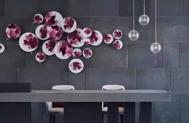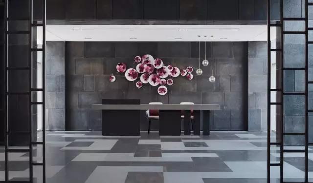 預(yù)接待吧臺(tái)與大廳講究整體的對(duì)稱(chēng)平衡,通過(guò)巧妙的吧臺(tái)構(gòu)成形式、空間吊燈的位置,呈現(xiàn)靈動(dòng)的立面關(guān)系,有效緩解空間的呆板。大面積深灰色石材,配以紫色壁飾花瓣式鋪灑開(kāi)來(lái),夾雜一絲神秘感,東方韻味無(wú)限彌散。
