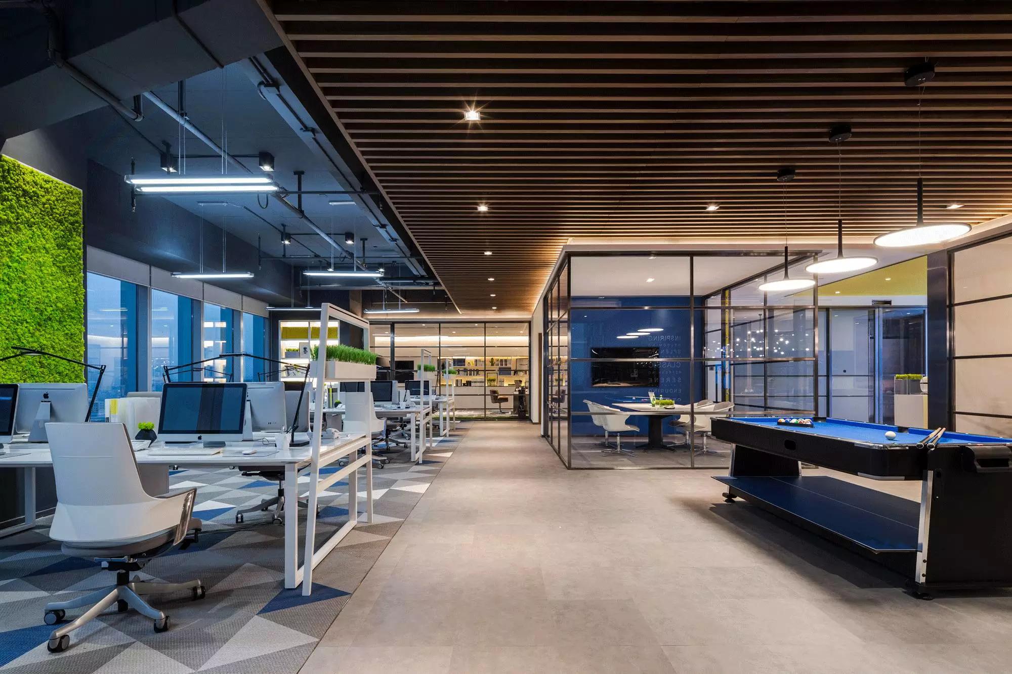裸露的天花與木格柵的設計,形成反差,重點突出了原建筑的空間感,與時下設計熱點相適應;臺球的細節(jié)設計,體現(xiàn)了公司對員工精神層面上的關懷,工作之余,還可打一桿臺球放松身心。