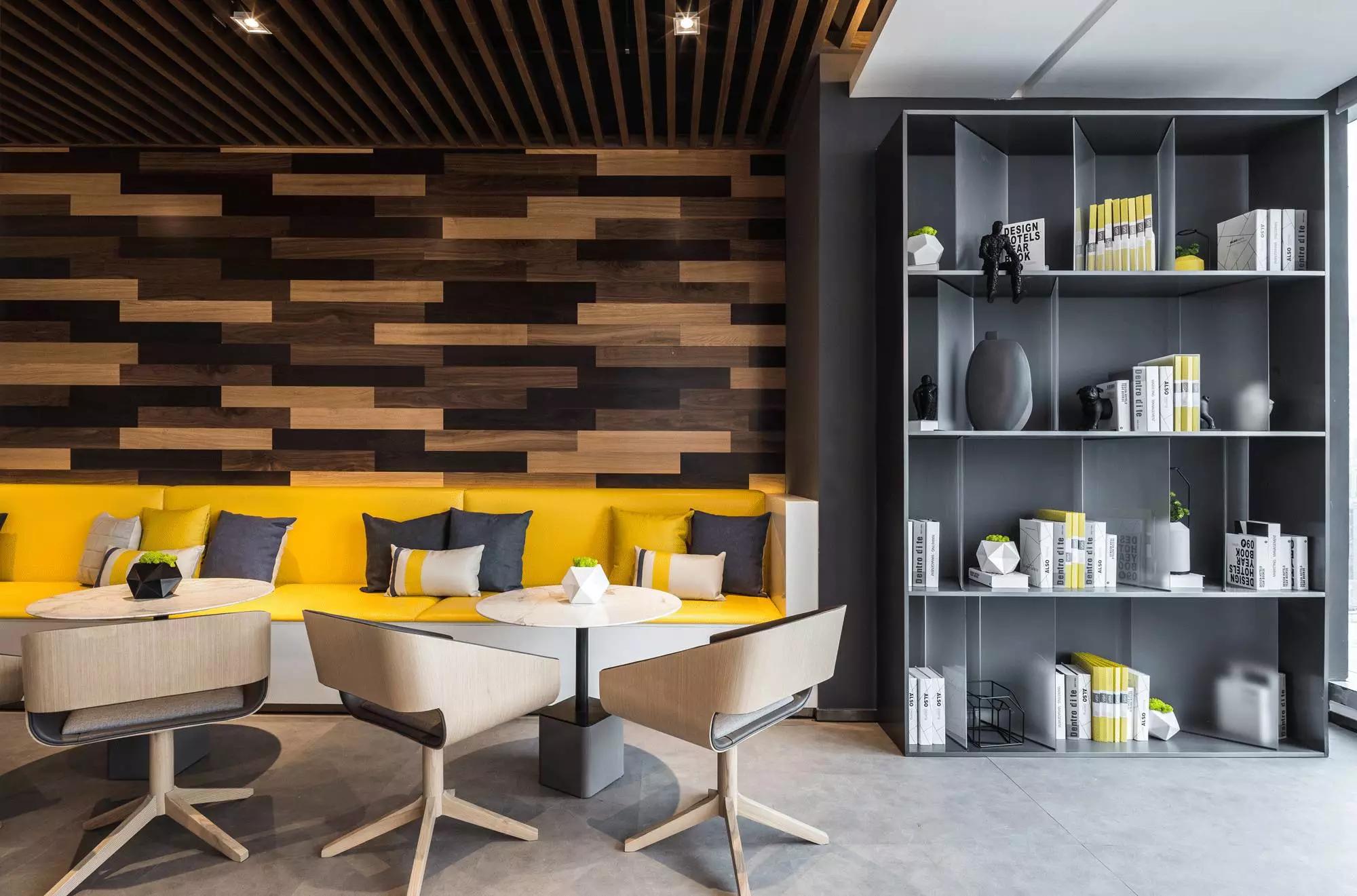 設計師用藍與灰搭配出冷靜主色調(diào),綴以沙發(fā)的暖意來提亮空間,而背景以深淺原木交錯搭配,設計流于細節(jié)之中。閑時,或仰臥在沙發(fā)上、在其旁邊的書柜看一會兒閑書,或坐在沙發(fā)上與同事聊聊天、聽一段舒緩的音樂、下一盤棋,小憩之后再投入工作,想必效率也會更高。