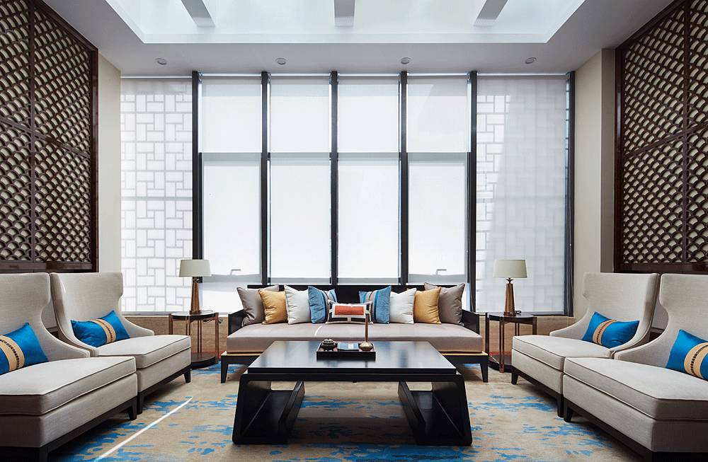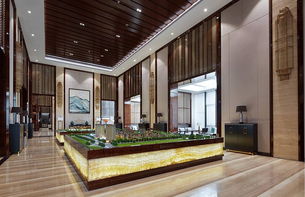 沙盤區(qū)采用簡單、大氣的設(shè)計手法,沒有濃墨重彩的奢華場景,更多的是將歷史古都的韻味帶到細節(jié)中,如格柵、窗欞、黛青色擺件、意境掛畫等東方元素都透露著古韻,并融入大理石、玻璃、燈帶等現(xiàn)代材料,在營造意境的同時兼顧場所的使用功能。