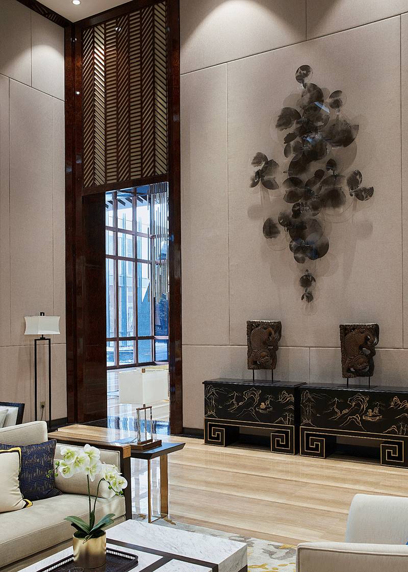 進入大堂中心,便被一個奪人眼目的裝置藝術(shù)吸引,數(shù)百根不銹鋼條垂吊而下,宛如瀑布“飛流直下三千尺,疑是銀河落九天”,成為整個空間的視覺焦點,啟動后,水珠從不銹鋼滴落到地景的水中,呈現(xiàn)出“大珠小珠落玉盤”的動感。
