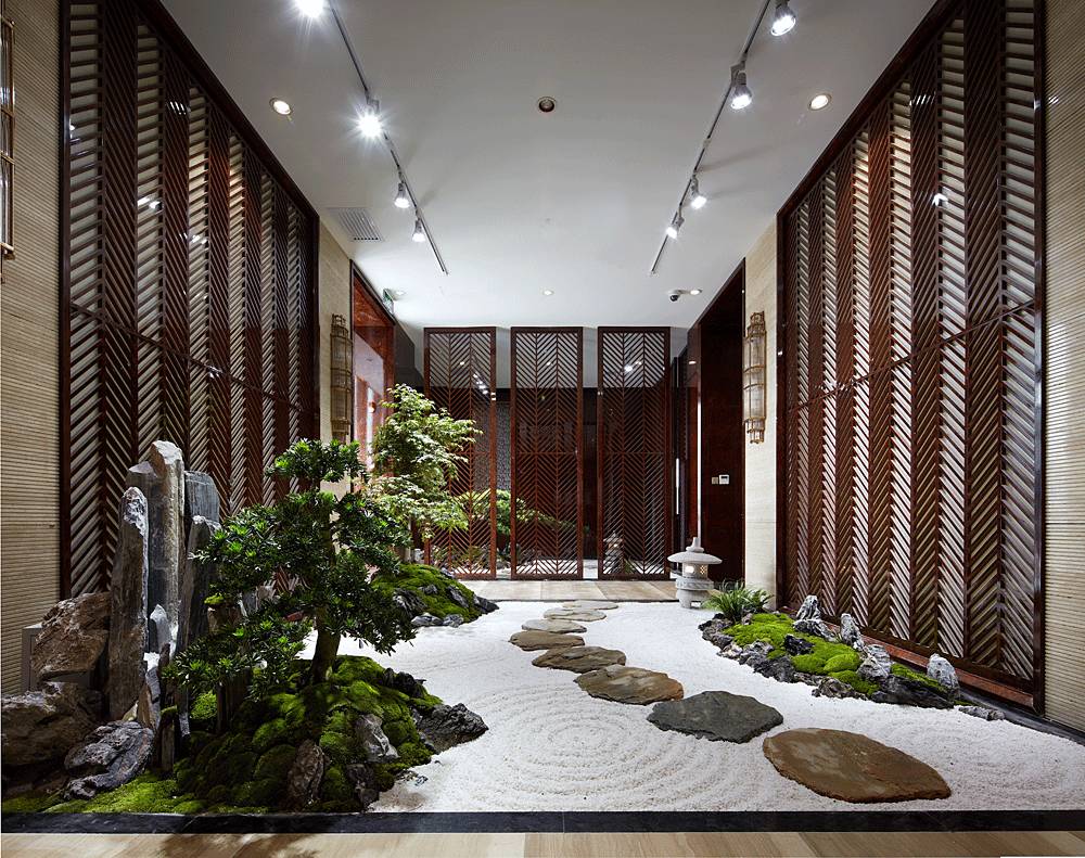 值得一提的是,走廊干景步道的景觀軟裝,一個集觀賞、生態(tài)、自然于一體的設(shè)計。小巧石籠、粒徑不等的灘石,旱濕均可培植的苔草地被,有機地組合在一起傳遞古樸自然的審美趣味,讓營銷中心的意境之美濃郁幾分。